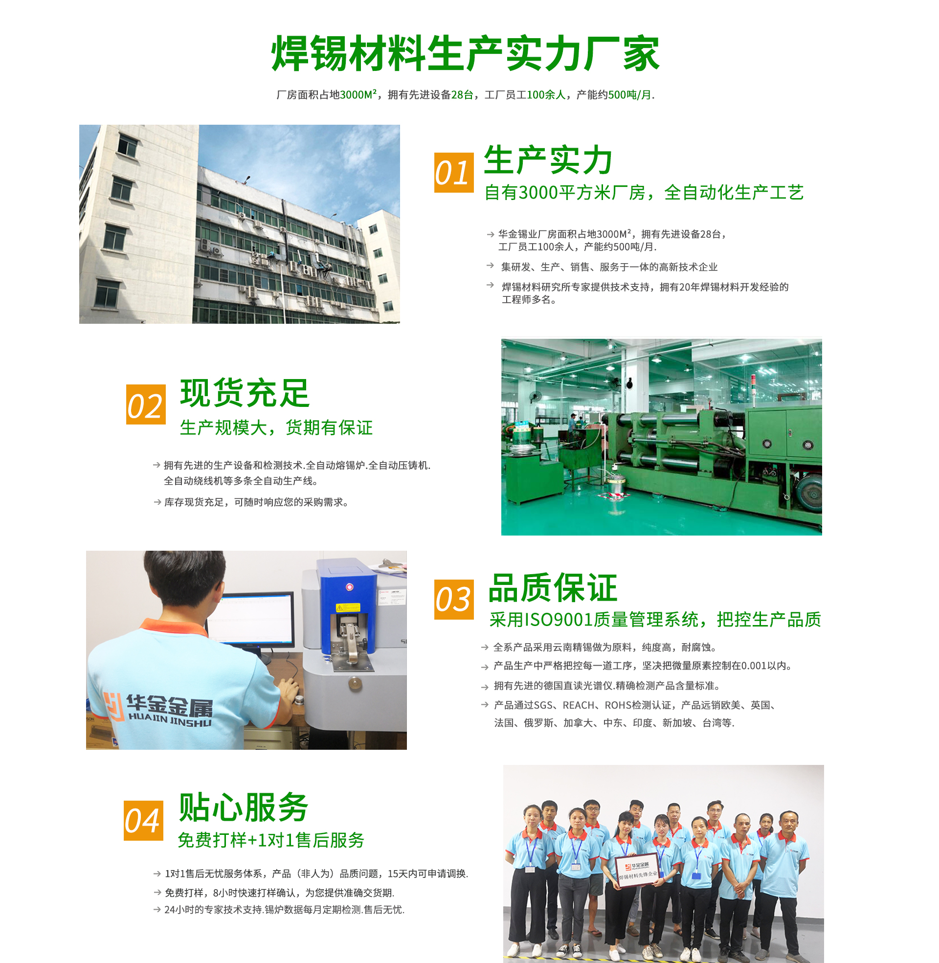 華金錫業(yè)有限公司一家資深的專業(yè)焊錫制品生產廠家,多年專注焊錫制品生產加工。產品有無鉛錫絲.無鉛錫條.錫板.錫膏.錫珠等.公司憑借多年的經驗和不斷的科技創(chuàng)新.生產的產品各項技術性能均達到國家標準.歐盟標準。并獲得眾多使用廠家的肯定.為適應環(huán)保要求.本公司2003年巨資投入生產無鉛焊錫,多年來連續(xù)通過SGS環(huán)保認證.產品規(guī)格齊全,使用性能極佳。客戶群體遍布全國各地及國外用戶。華金錫業(yè)焊錫制品是選用一線品牌作為原材料,采用選進的配方,精工制作各種規(guī)格不同的型號,再采用全自動流水線作業(yè)擠拉成各種符合要求的焊錫絲和焊錫條。華金牌焊錫制品以其一流的品質,真誠的服務,產品銷往全國各地,深受廣大用戶的高度贊揚。